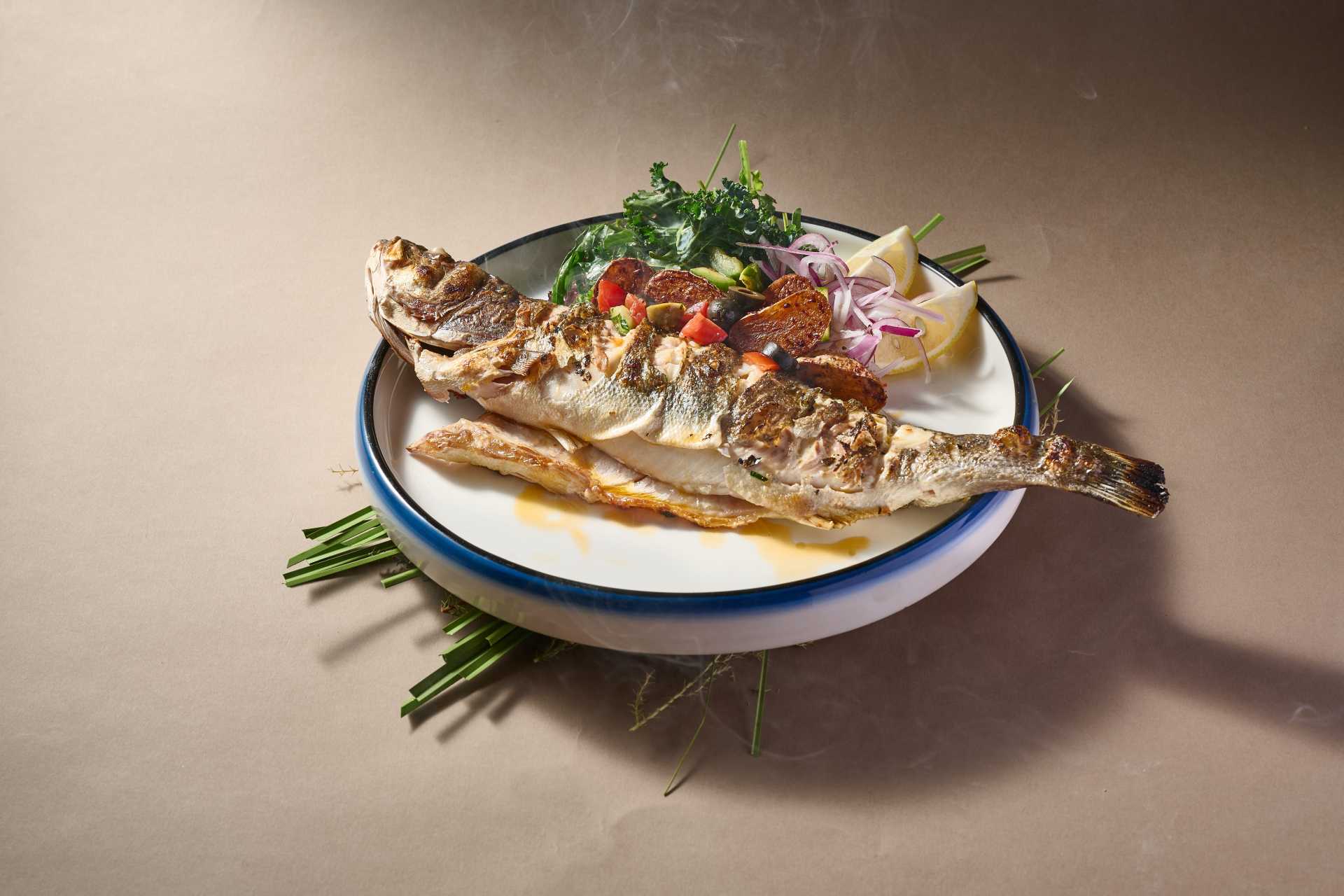 • A 550g whole seabass char-grilled to perfection.